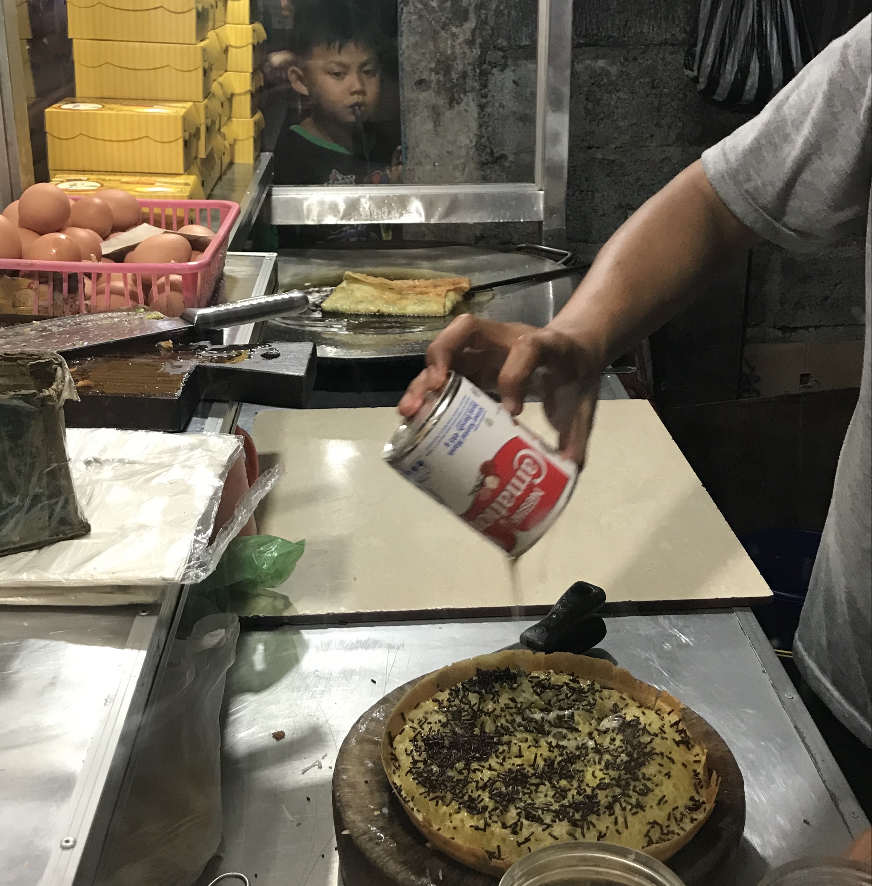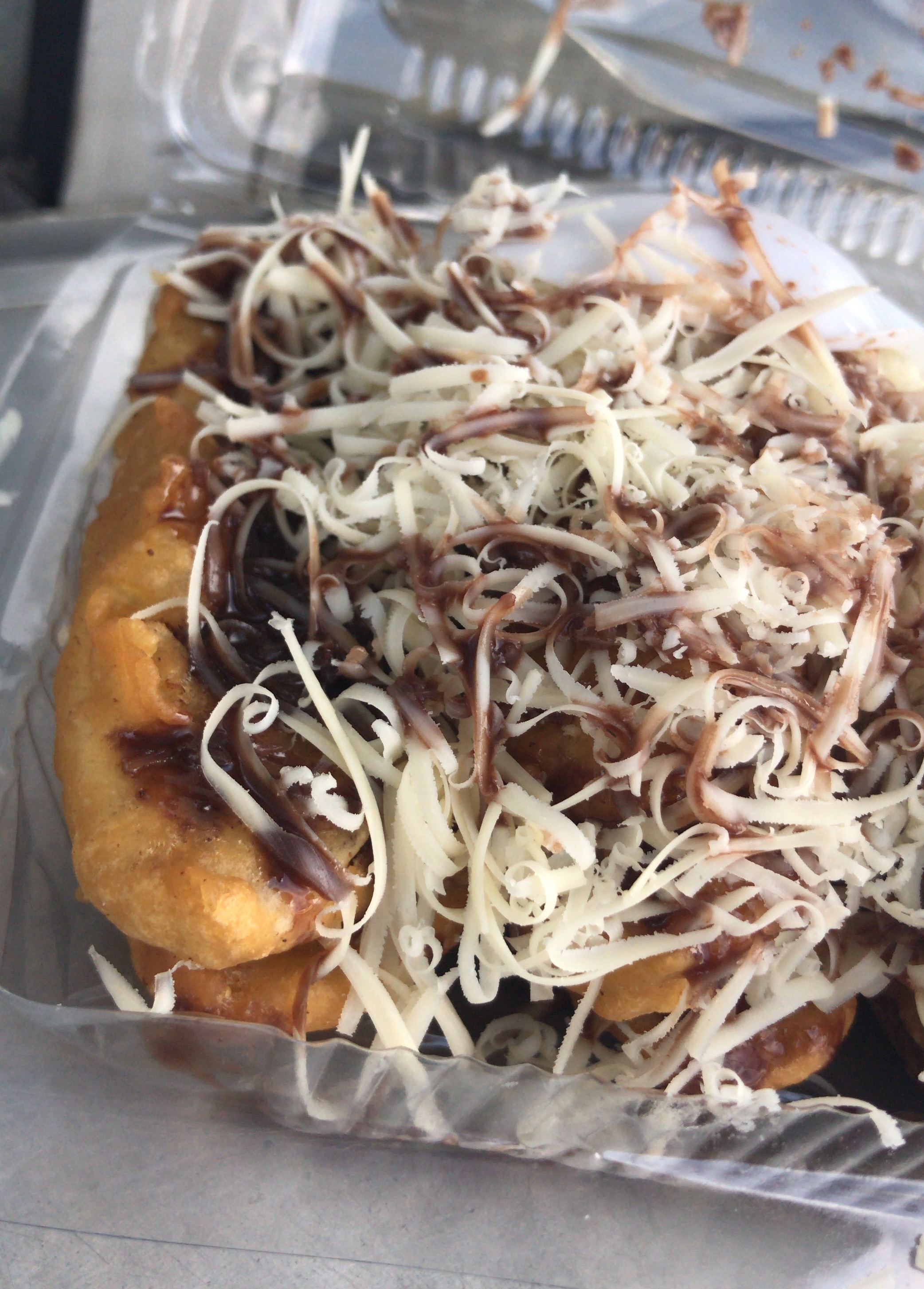 (the locals eat it topped with cheese [keju] and chocolate [cokolat])