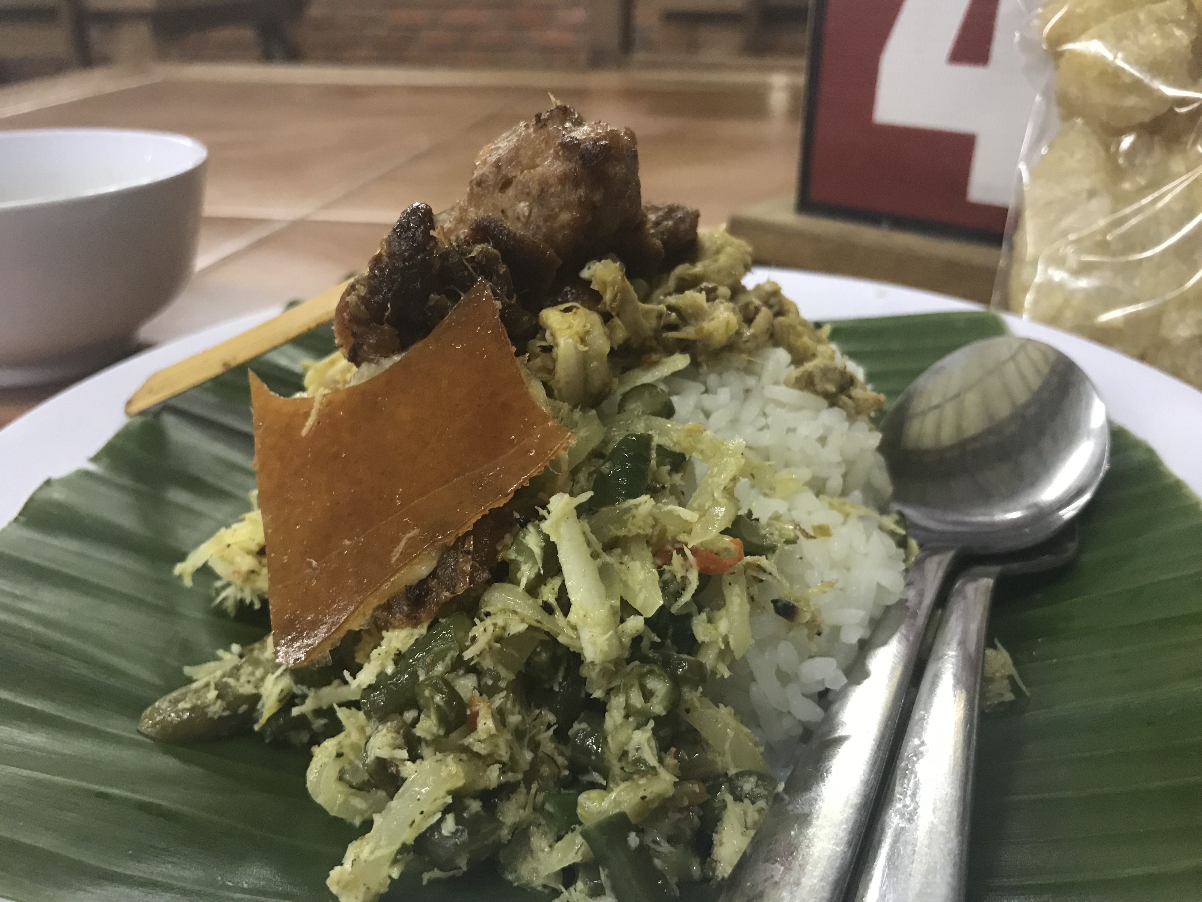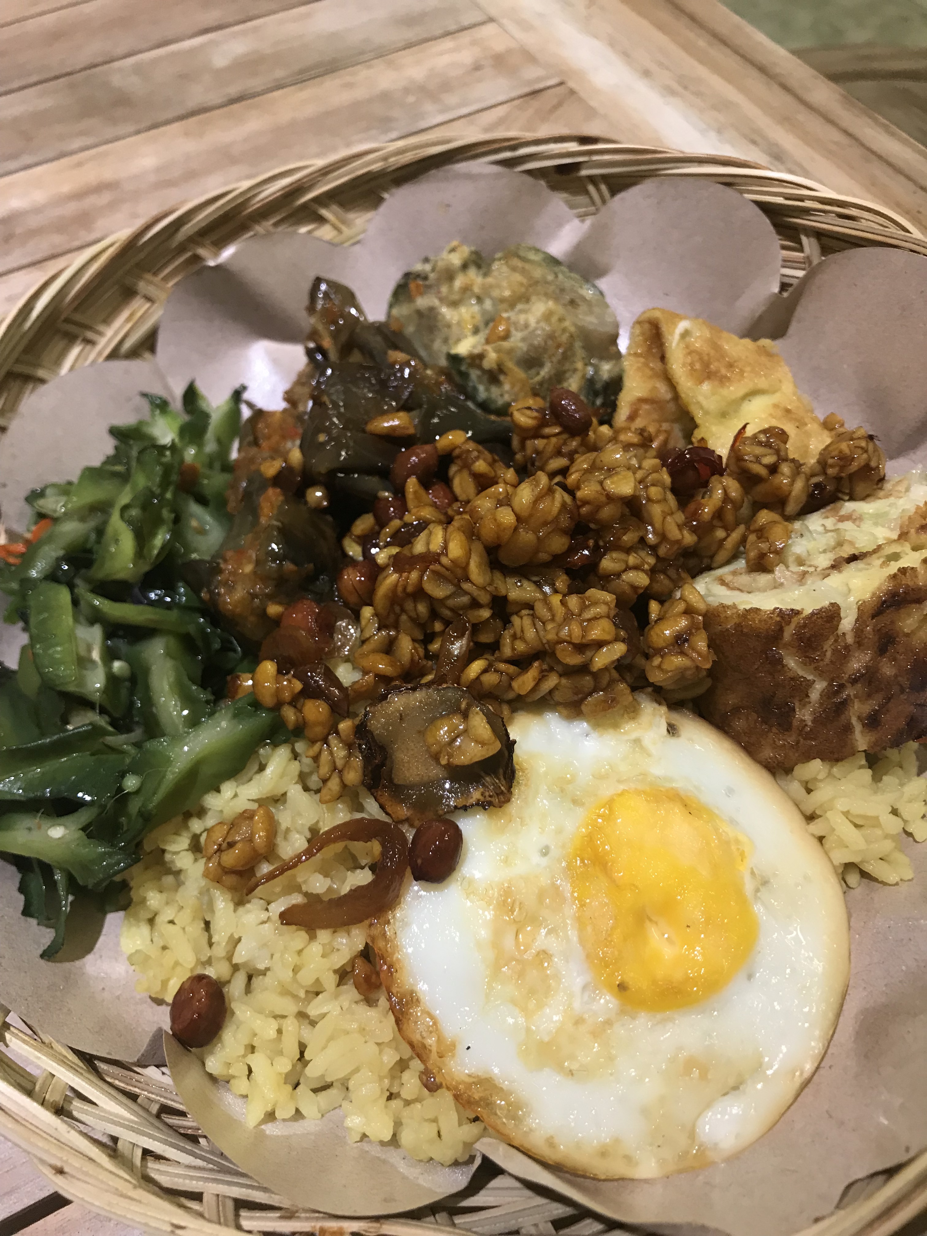 This is one of my FAVORITE dishes, especially at THIS specific warung, because there’s so many veggie options (I don’t usually eat meat – I don’t really like it). Plus, it’s the only warung I’ve found in the area that serves the telor dadar (indonesian “egg rolls/wraps” that are literally heavenly egg pillows of deliciousness) and that serves the fried tempeh with spicy peanuts (trust me, it’s a game-changer). So yeah, I would 300% recommend this meal and this restaurant to anyone in the Canggu area!
