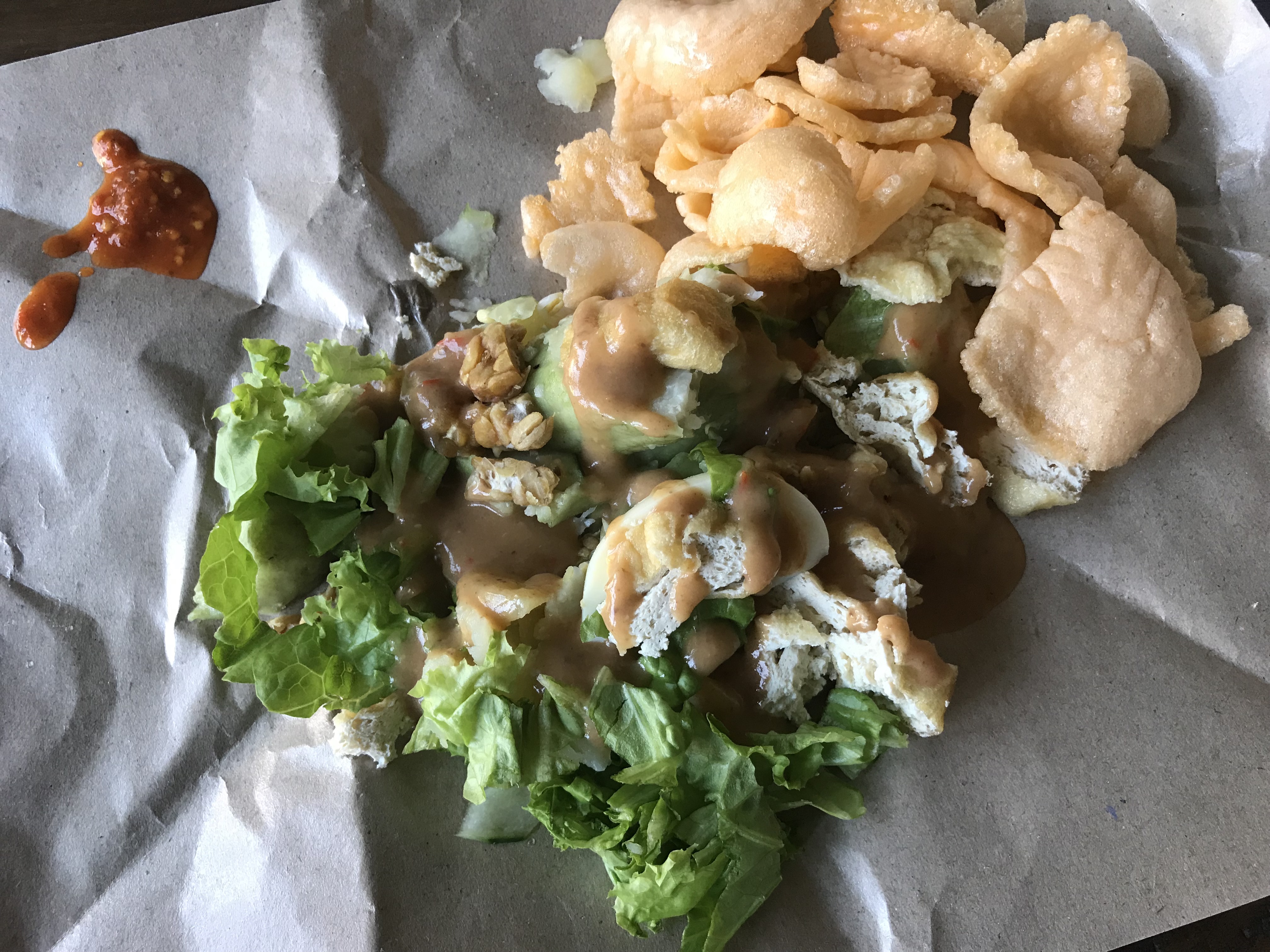 Although it’s really similar to gado gado, I would MUCH rather eat gado gado than this. It wasn’t bad, but it also just wasn’t my favorite. I think it’s a ratio thing. It was too much tofu for my liking (I’m not really a tofu person). But i’d probably get it again, especially if it was served at a warung and I got the chance to see if maybe it tastes better at a warung vs. a street cart (just like the gado gado). I recommend it, especially if you’re looking for vegetarian- and vegan-friendly local dishes in Bali.