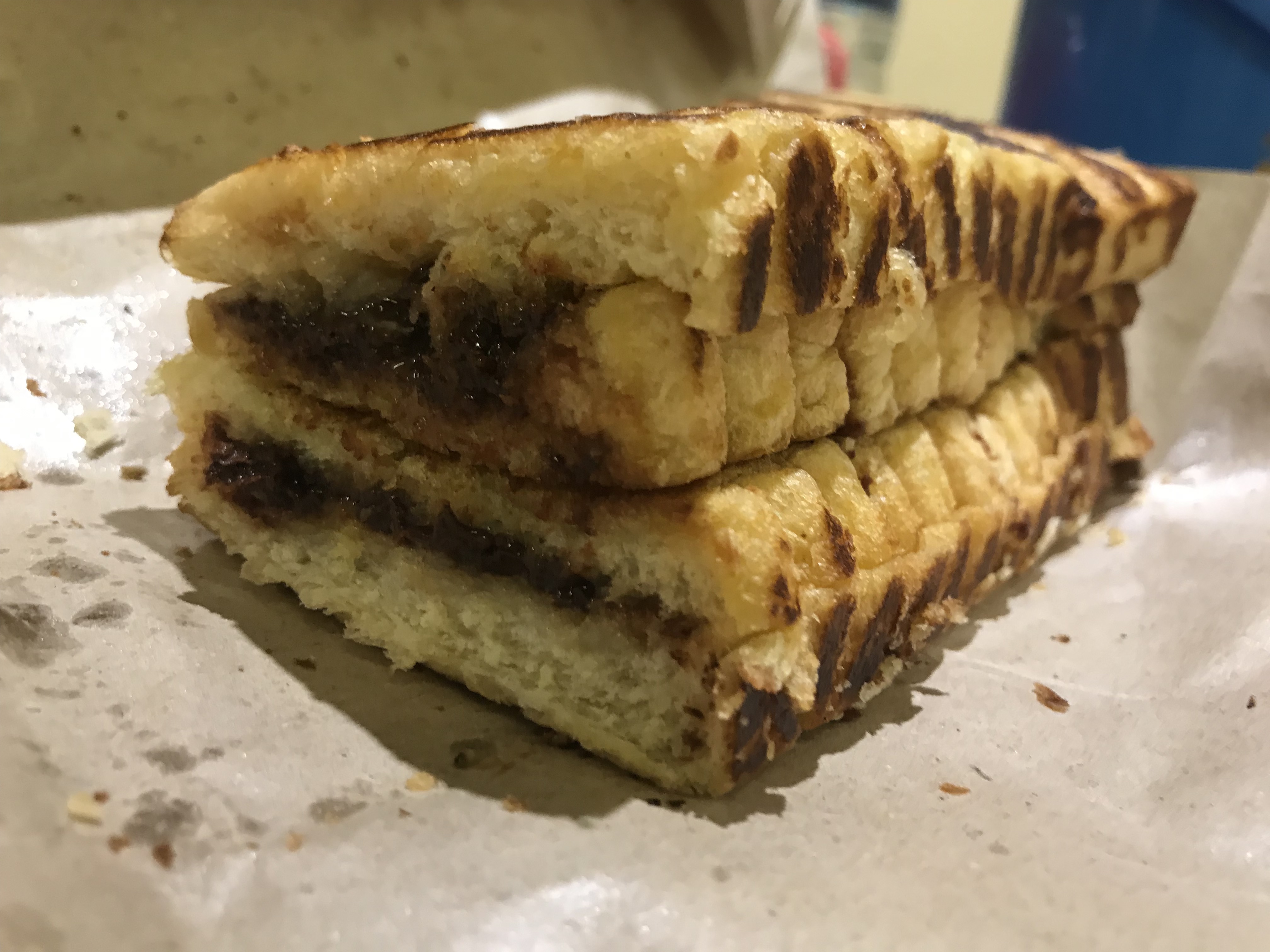 Cokolat Roti Bakar: thick bread sliced in half, covered in butter, and filled with chocolate and sweetened condensed milk and then grilled on the stove … hands down one of my favorite desserts!